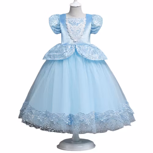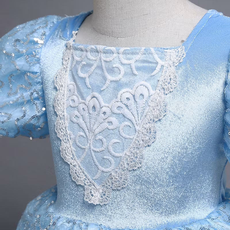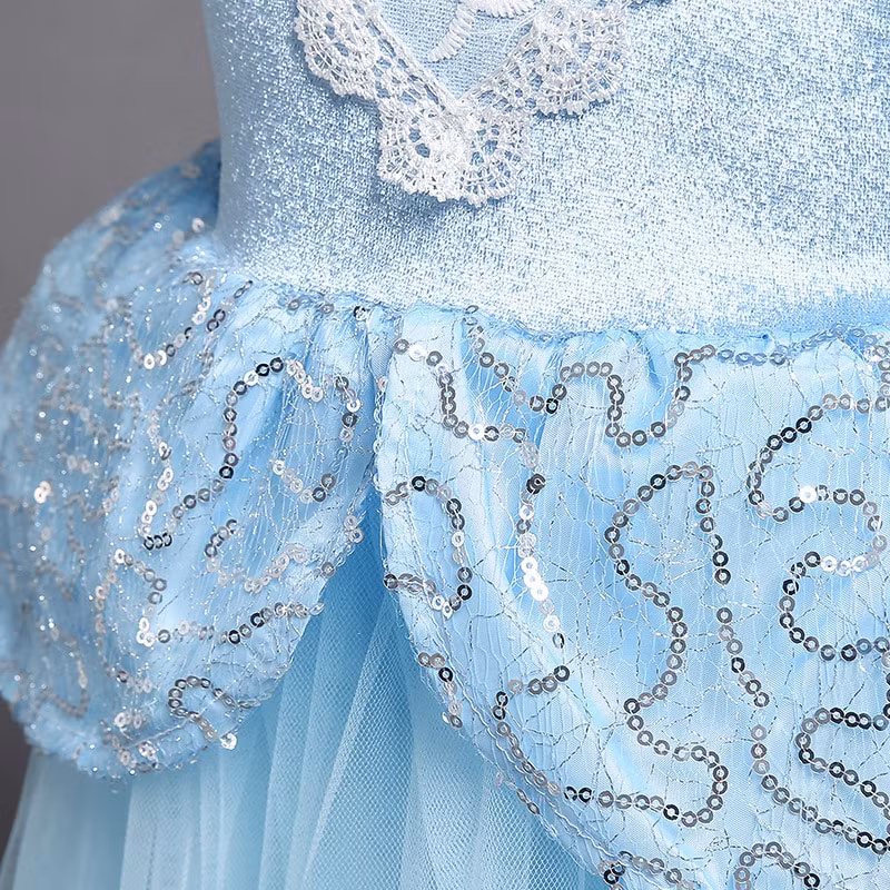 Prinsess klänningens kjol har bred blå spets och dekorerat med glittrande paljetter. Kjolen har ljuvlig blå tyll.
