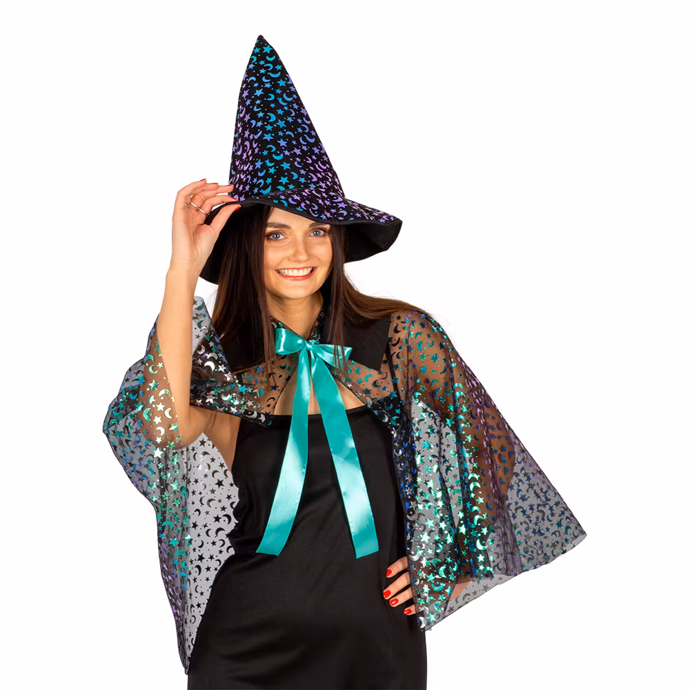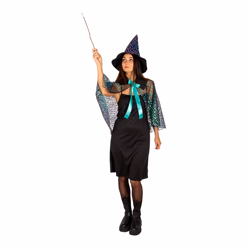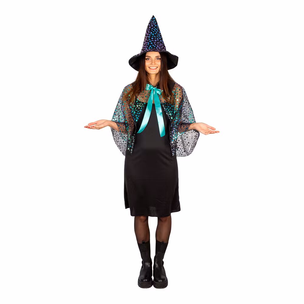 Innehåller klänning, cape och hatt.