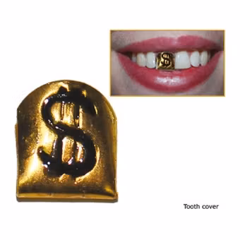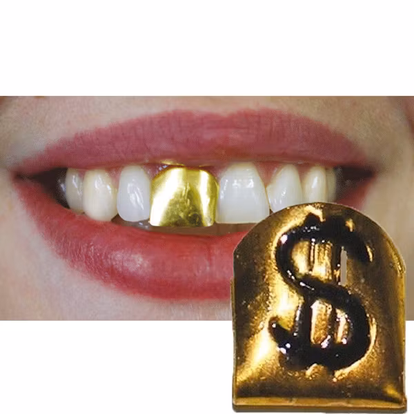 Guld- tand med dollartecken. Du kan skjuta denna gyllene tand med ett dollartecken över din egen tand. Fantastiskt för att komplettera din hallickdräkt!
