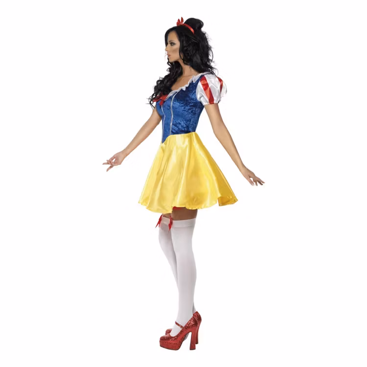 I förpackningen inkluderar: Sexig Snövit klänning med en skimrande gul kjol och blå topp samt en fastsydd spetsig röd underkjol, hårband, ett strumpeband och (Choker) band till halsen. Klänningen är också dekorerad med silvriga ränder på framsidan och har vita ärmar dekorerade med röda band, en vit urringning och en röd rosett på framsidan.